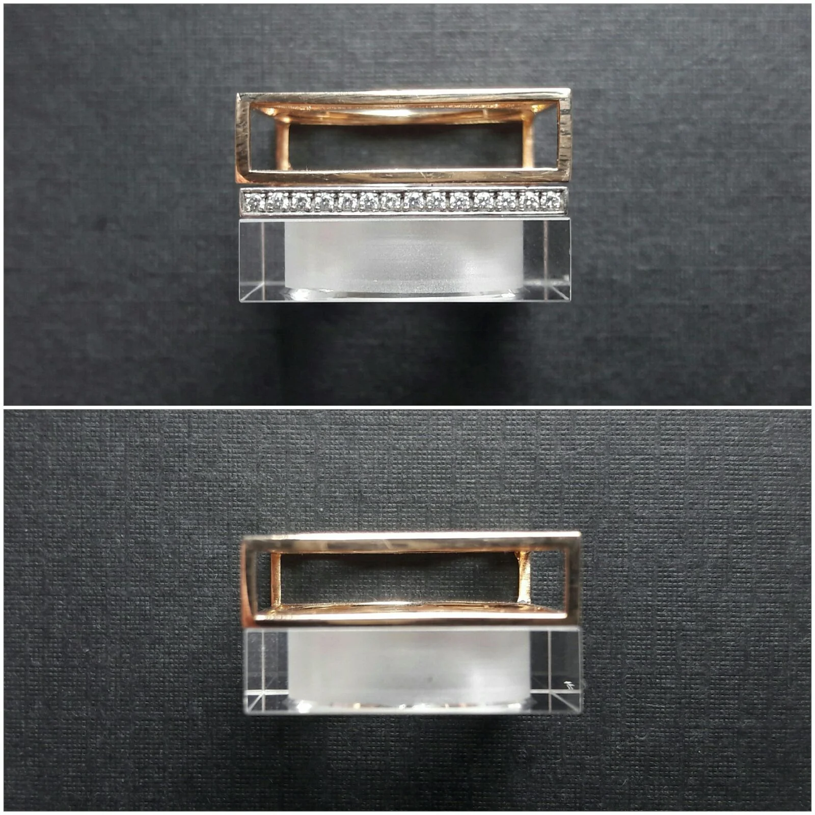 Ein schmaler Block mit gleichem Außenmaß von 2.5mm Dicke dient als Unterstreichung, metallisch farbig, keramisch farbig oder üppig, traditionell Verschnittausgefasst mit Vollschliff Brillanten schließt er die Reihe der quadratisch blockhaften Formen zunächst ab.